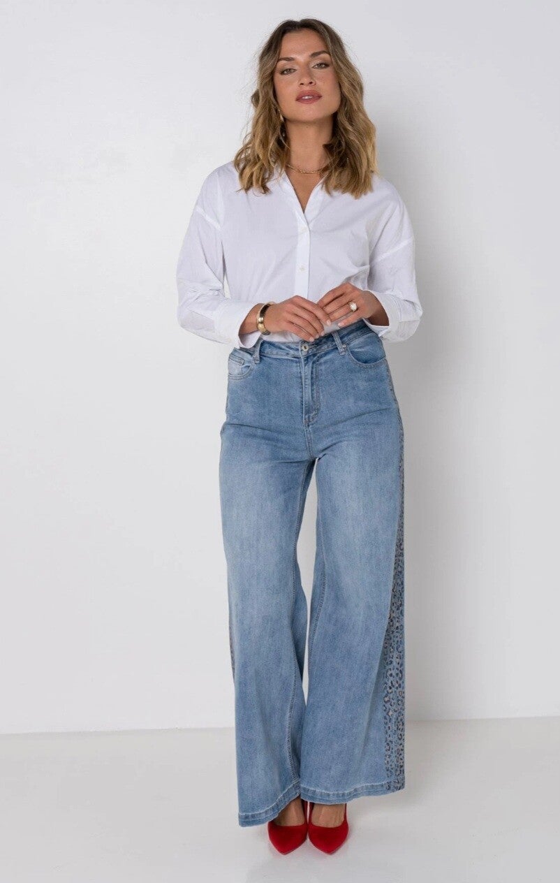 Jeans large tendance, imprimé léopard latéral et effet push Up à l'arrière !