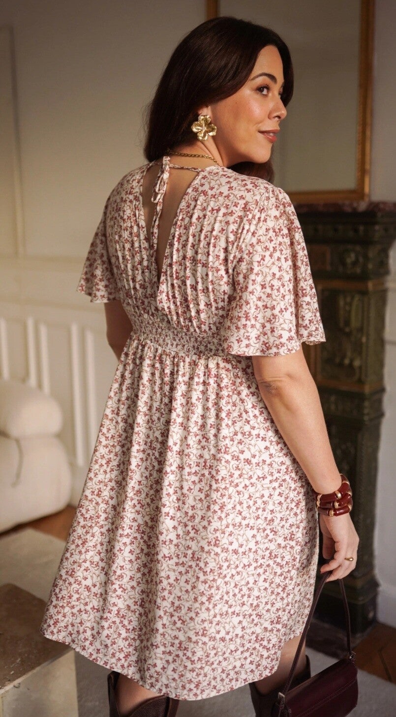 Robe courte fluide à imprimé floral, décolleté noué dans le dos et taille froncée pour une allure douce et féminine.