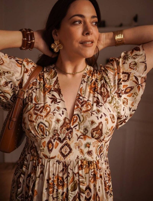 Robe longue fluide à imprimé floral bohème, dotée d’un décolleté en V et d’un lien dans le dos. Taille froncée pour une silhouette féminine et confortable. Parfaite pour un look estival chic et naturel.